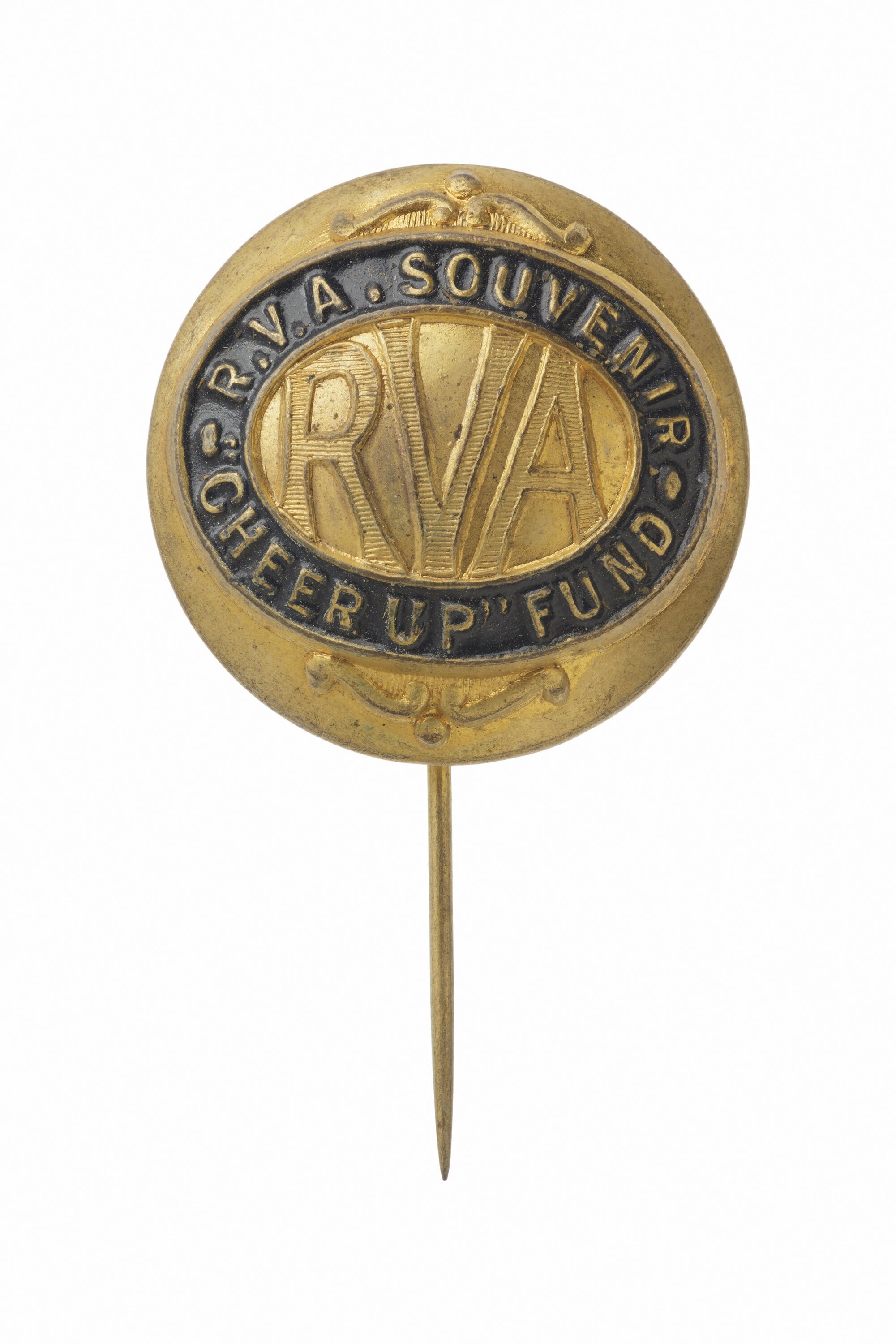 Circular, rounded metal badge with stickpin at back. Gold in colour with black enamelled inner raised border with words "R.V.A. SOUVENIR. CHEER UP FUND". Stickpin at back. Raised centre with letters "R V A". Design pressed into metal and showing through back.