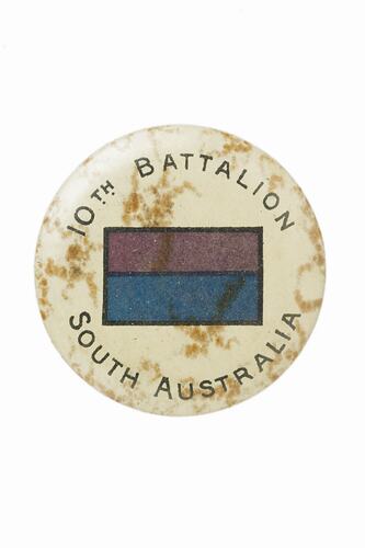 Round metal badge with white background and the colour patch of The 10th battalion in the centre. Words 10th BATTALION SOUTH AUSTRALIA are around edge. Pin at back fits into slot.