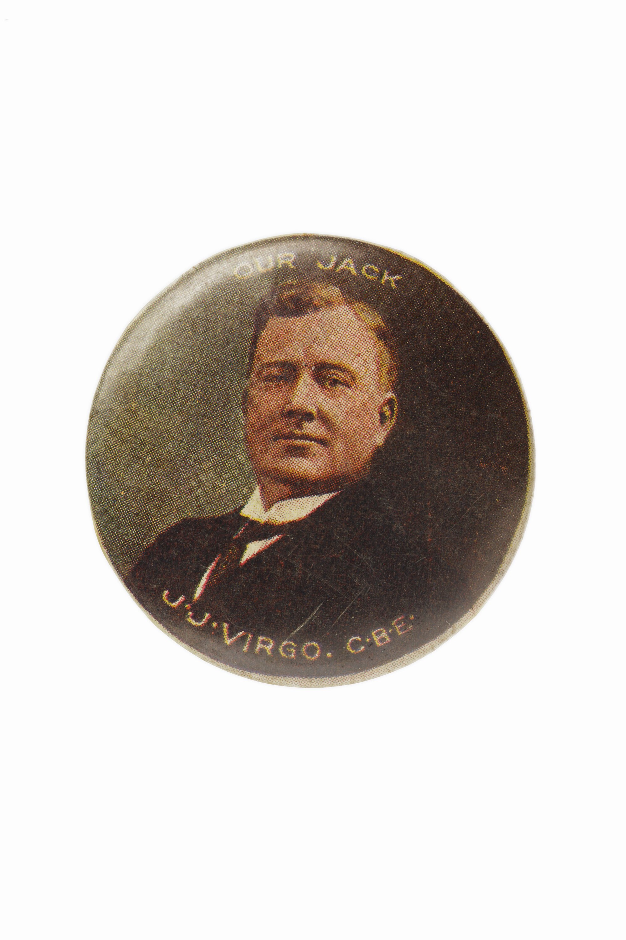 Round, metal badge with thin white outer rim. Dark back- ground with picture of head and shoulders of a male. OUR JACK at the top and J.J. VIRGO. C.B.E. at the bottom. Pin at back fitting into a slot.