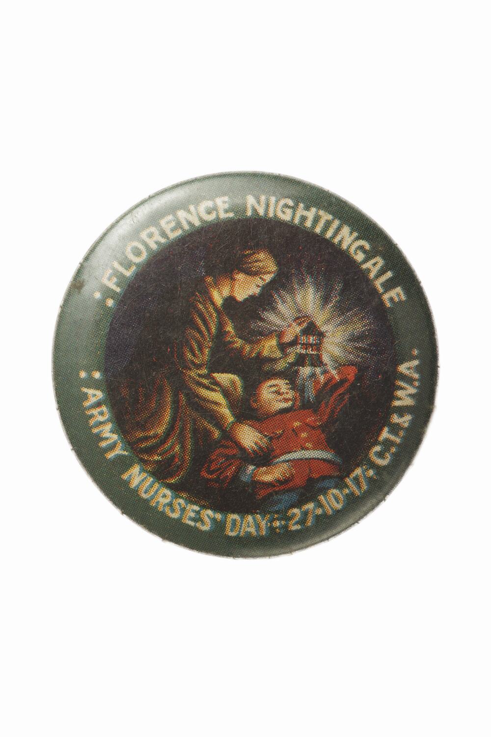 Round metal badge with a dark green edge and a picture of nurse tending a soldier. Nurse holding a lamp. Wording round edge" :FLORENCE NIGHTINGALE (top) :ARMY NURSES DAY. 27*10*17* C.T.& W.A." Pin at back that fits into slot.