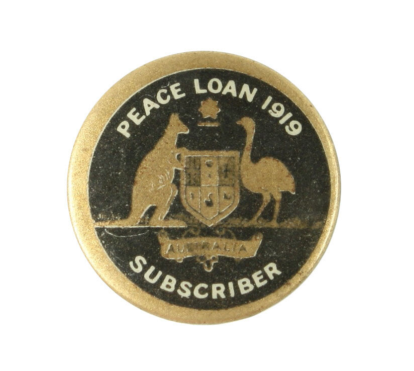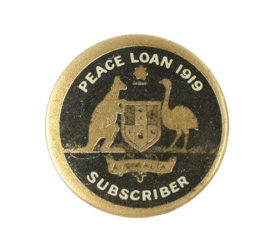 Round metal badge in black, gold and white. Gold border, black centre with Australian coat of arms in gold. White lettering round edge "PEACE LOAN SUBSCRIBER". In banner under arms "AUSTRALIA". Pin in back fits into slot.