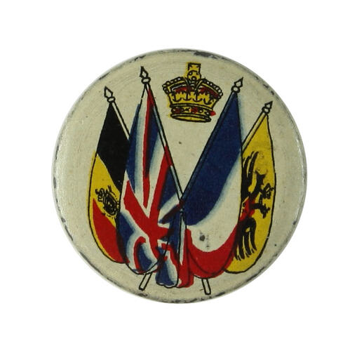 Small metal badge dating to World War I. It features the flags of the Allied nations: Belgium, Britain, France and Russia. The flag depicting Russia is the Imperial Standard used by the Tsar - changed during the Russian Revolution. As Russia also withdrew from the war due to the revolution, this badge must have been made no later than 1917.