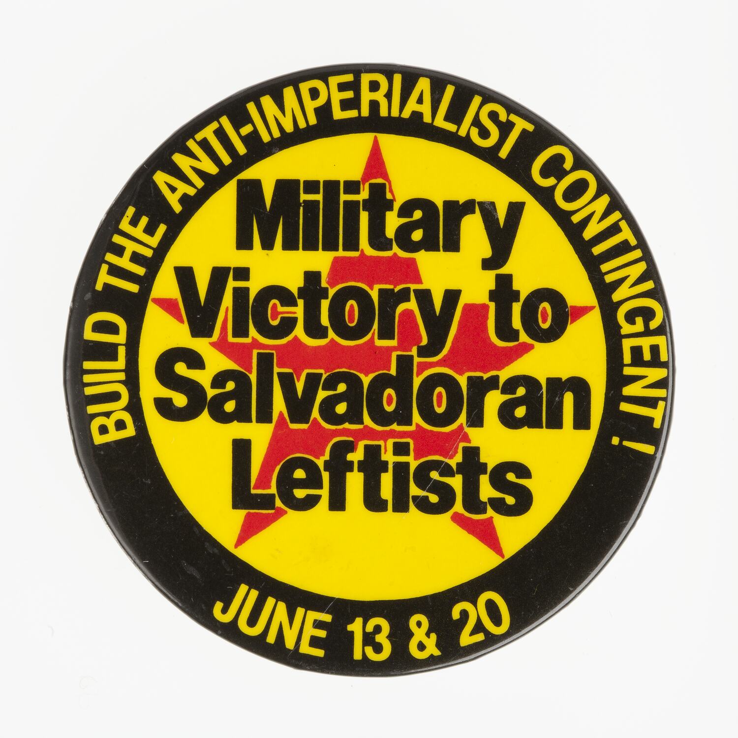 Printed obverse: 'BUILD THE ANTI-IMPERIALIST CONTINGENT!/ JUNE 13 & 20/ Military/ Victory to/ Salvadoran/ Leftists' Engraved on reverse: 'PATRICKS BADGES PTY. LTD./SUMMER HILL N.S.W. /02-797-0333'