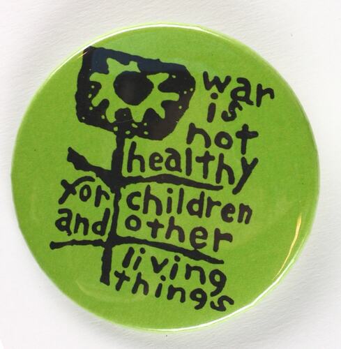 Round badge with the slogan 'War is Not Healthy For Children' made and used in 1980. This is one of a series of badges and peace movement posters acquired by the museum following the exhibition 'Peace: an Exhibition' which explored the Peace movement and was part of the Victorian Government contribution to International Year of Peace in 1986. It was produced using the Badge-A-Minit, a semi-automatic badge-making machine. The acronym is impressed into the plastic insert at the rear of the button. This technology emphasises the DIY aspect of activism and protest and allows different groups to create objects bearing the message of their choice.