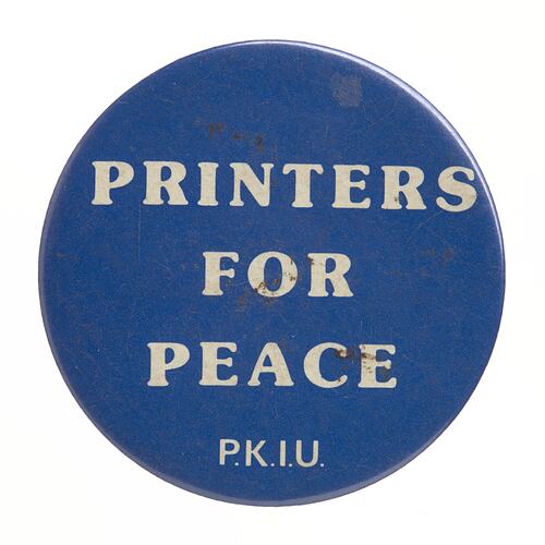 This badge was made circa 1975 - 1989 and used in Melbourne, Victoria, Australia, circa 1980 - 1989. It was made by the Printing and Kindred Industries Union. This was an Australian trade union active between 1966 - 1995, representing workers in the printing industry, as well as paper and cardboard manufacturing. This is one of many instances of particular professional groups appropriating the anti-nuclear dialectic and displaying a united protest stance. Other examples in the Museum Victoria collection include: 'Nurses against Nuclear War', 'Government Workers against the Bomb'.