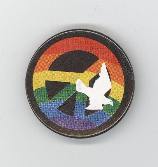 Small round badge with metallic silver back and lockable pin and plastic face. Face contains black background, rainbowed peace symbol and white dove.