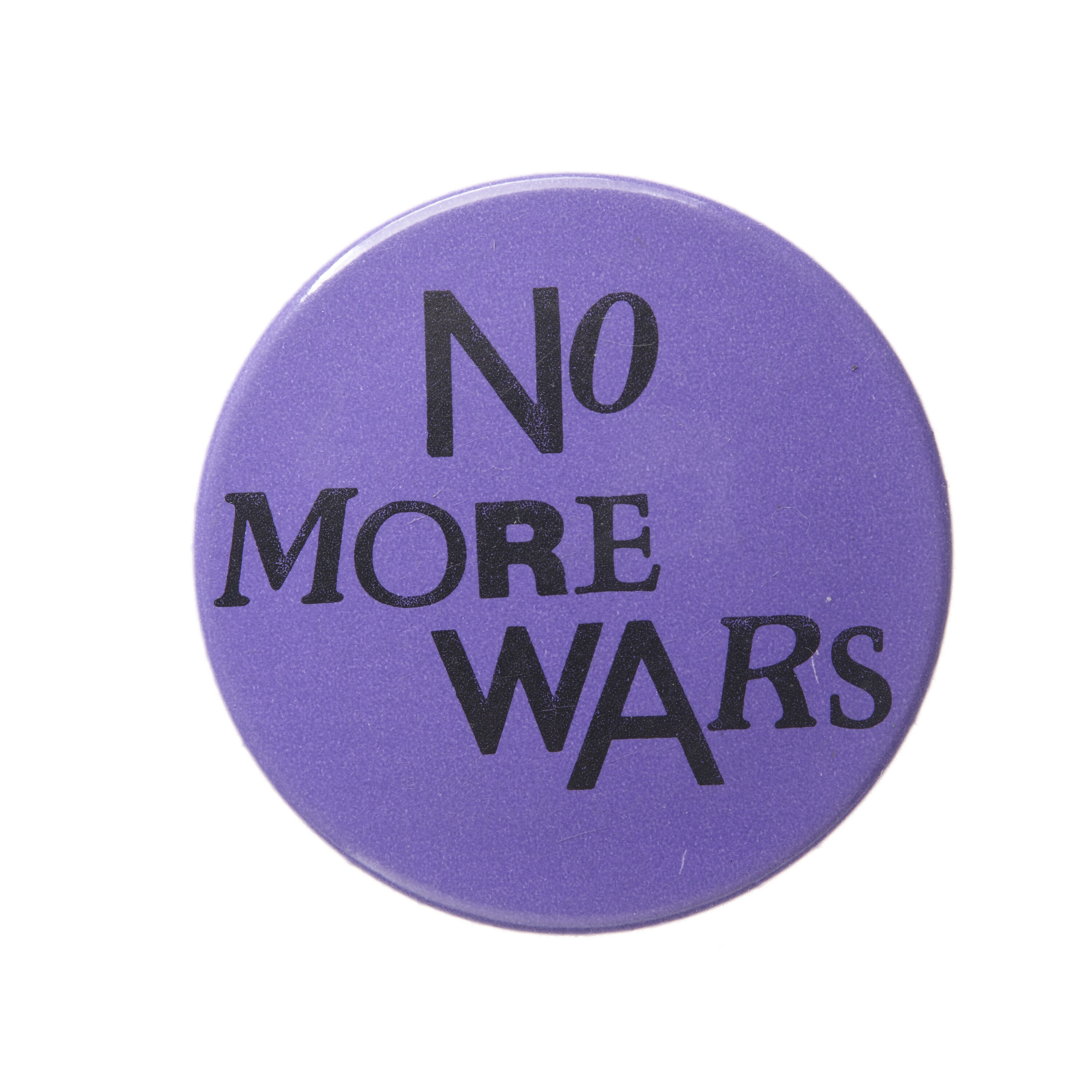 Circular purple badge with the slogan 'No More Wars', made circa 1980. This is one of a series of badges and peace movement posters acquired by the museum following the exhibition 'Peace: an Exhibition' which explored the Peace movement and was part of the Victorian Government contribution to International Year of Peace in 1986. The badges explore the peace movement, nuclear disarmament and Hiroshima.