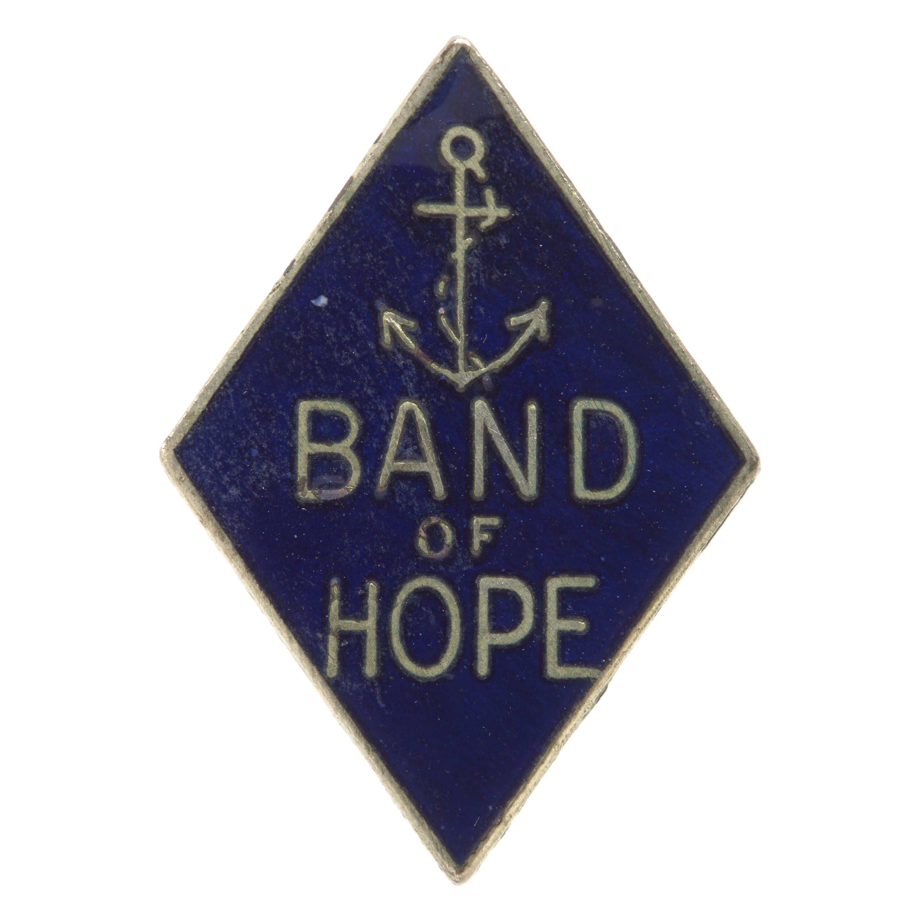 Diamond shaped metal lapel pin with metallic silver and lock able pin on the back. Face contains blue enamel and silver text and image of an anchor.