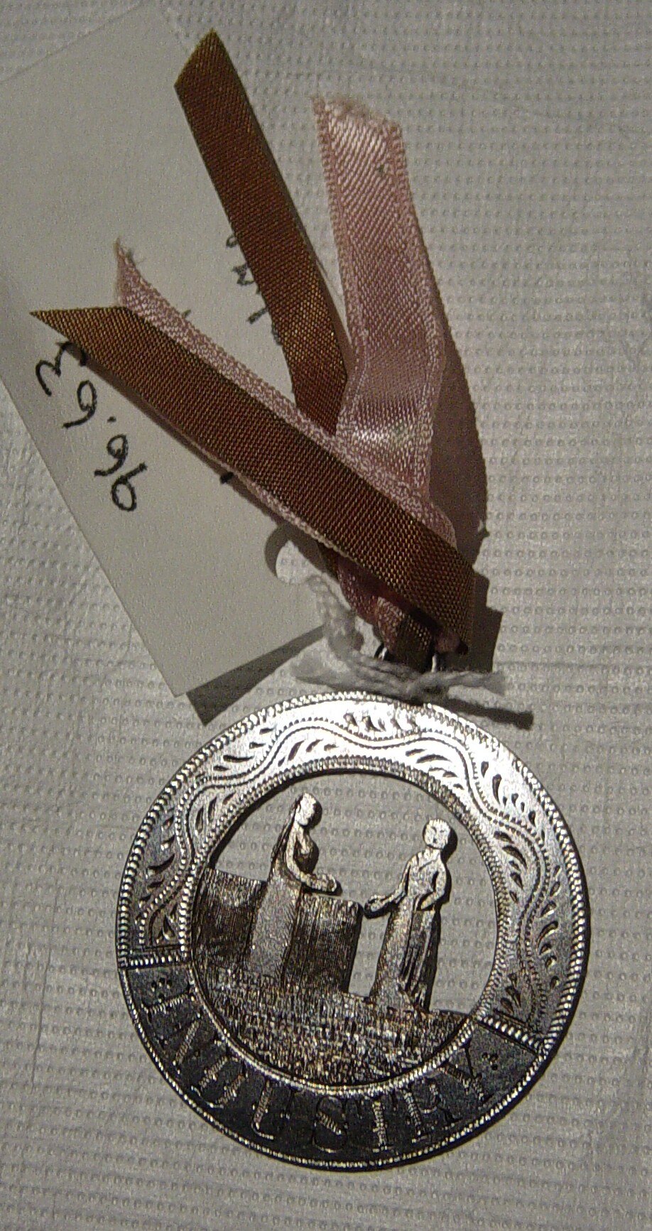 This medallion, known as the Industry Jewel, could be worn by all lodge officers in the Rebekah Lodge. The women on this jewel are Ruth and Naomi. The Rebekah Lodge is the female auxiliary of the Independent Order of Oddfellows.