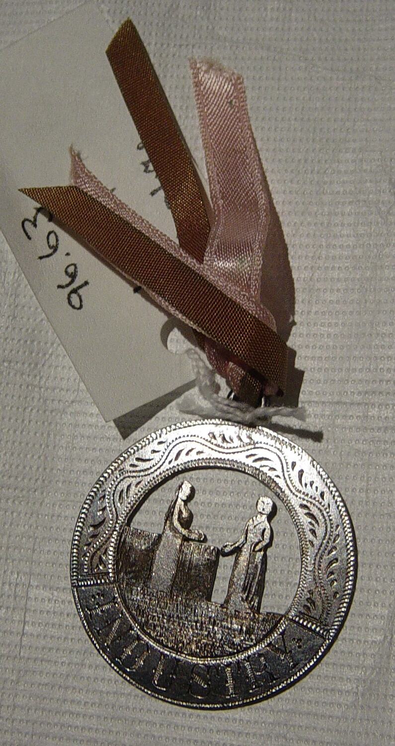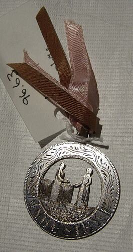 A circular jewel made of white metal, with a depiction of two women in the centre. Details on the jewel are engraved. At the top of the circle is an applied ring with one pink and one green ribbon threaded through and knotted. A small gold coloured safety pin is attached to the pink ribbon.