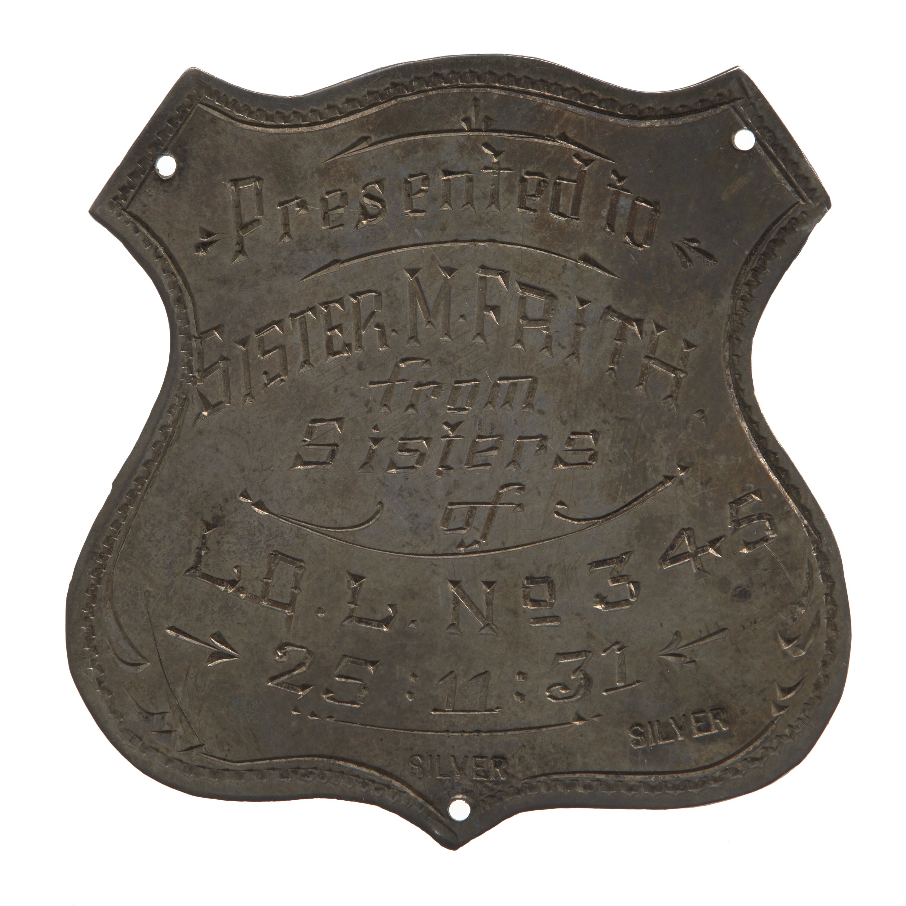 Small metal silver badge engraved and presented to a member of a Loyal Orange Lodge in 1931. The badge is in the shape of a shield. It has three tiny holes, two on the top edges, one at the base, to allow it to be sewn to a piece of cloth regalia. Presented to a member of the Loyal Orange Institution by other members, probably in honour of long service or retirement.