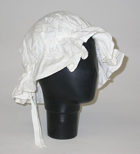 White linen mob-cap (house-maid's cap) worn by a staff member at a mental health hospital in Victoria, Australia, circa 1900.