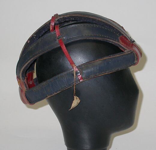Red and navy leather bicycle helmet, lined in navy felt. Consists of five strips of navy leather, running front to back. Secured at front and back by reather leather tabs. Thin red leather strap across crown holds strips in place.