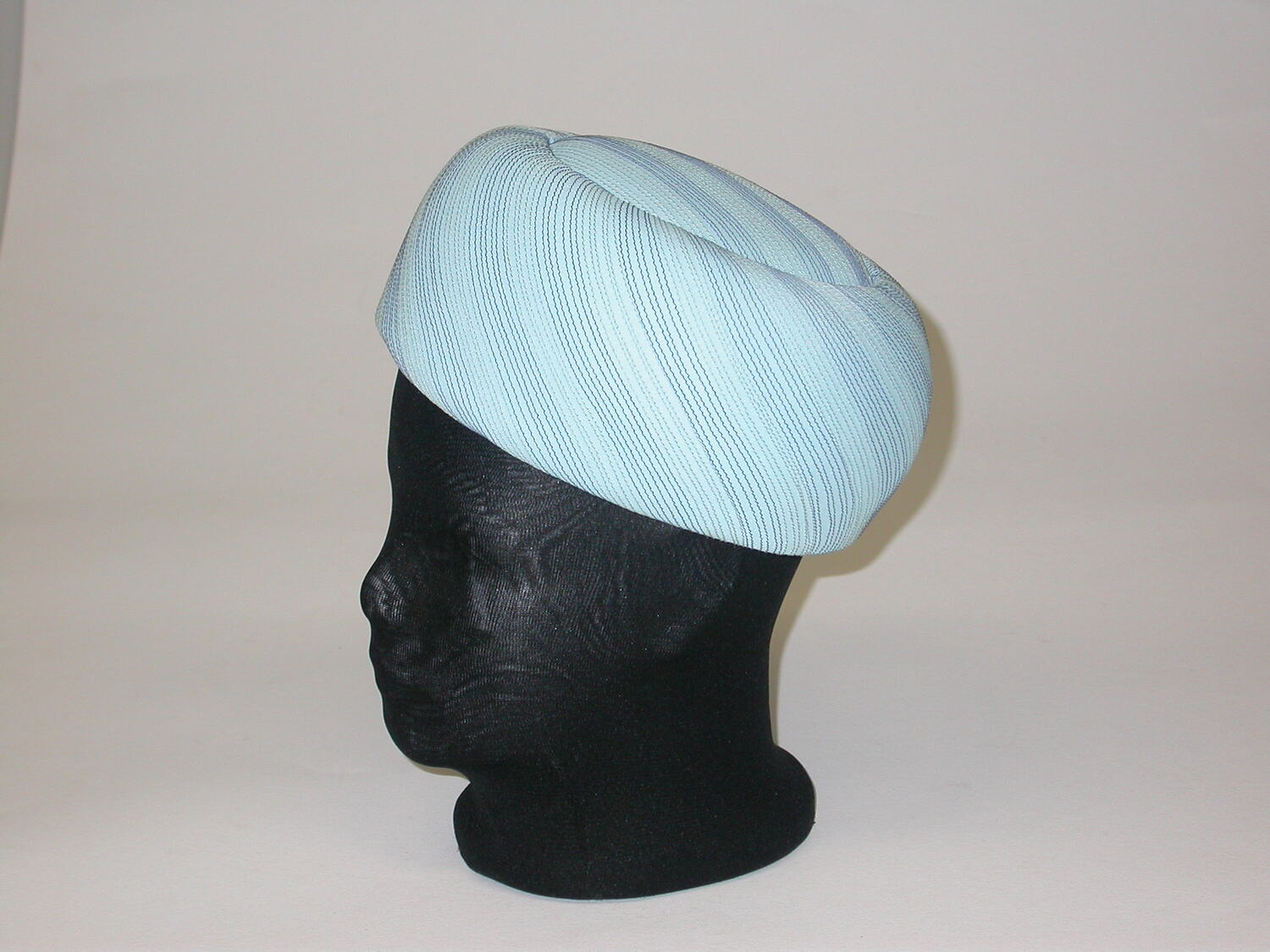 Aqua beret-style hat with machined sparterie and organza fabric. Style suggests 1960s date.
