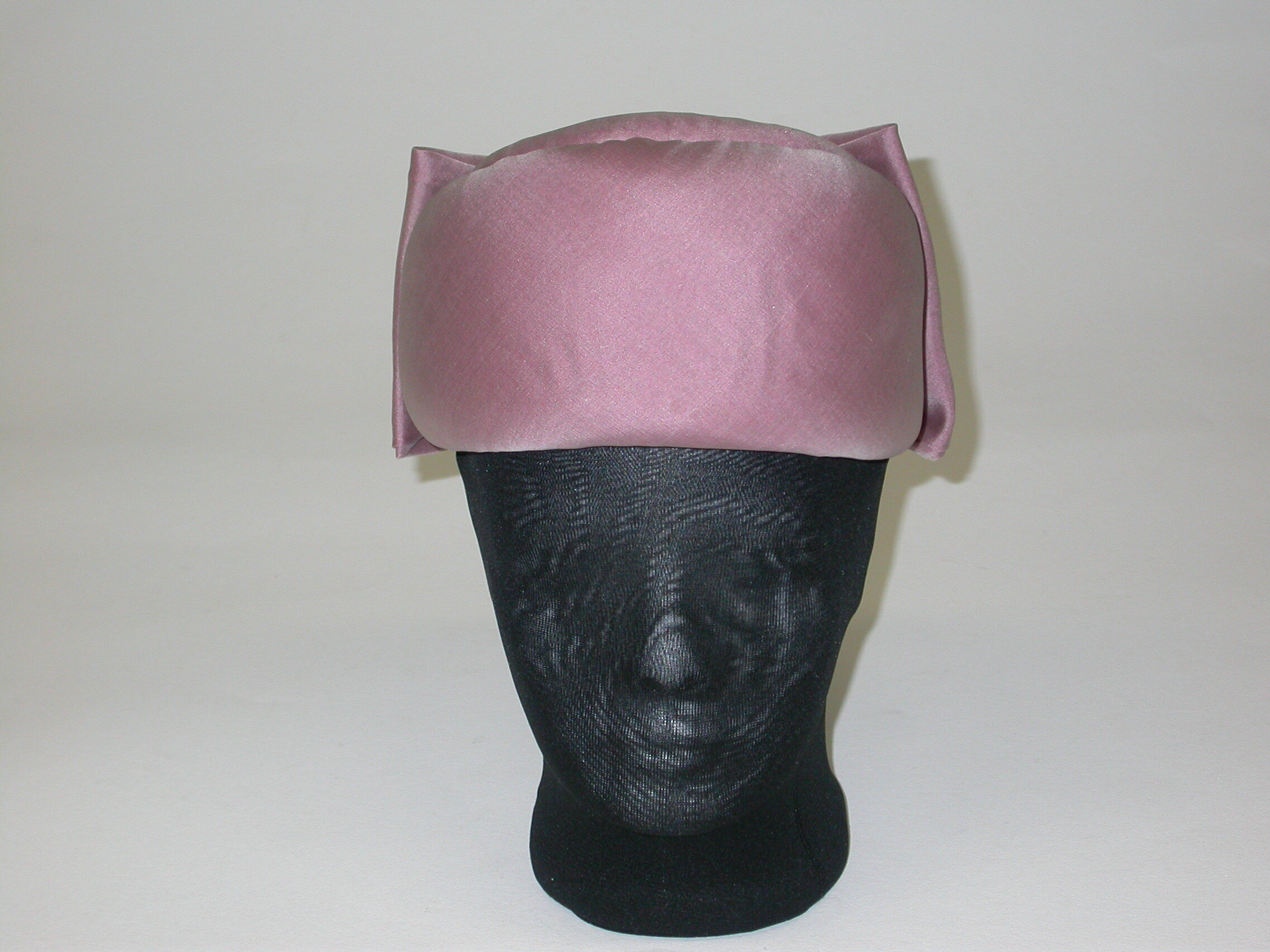 Pillbox-style hat made of pink tulle.