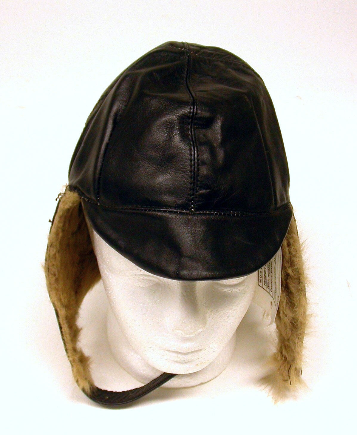 Dark brown leather bicycle cap, sou'wester style, head lined with red/yellow plaid. Neck lined with fawn rabbit fur. Neck strap with buckle.