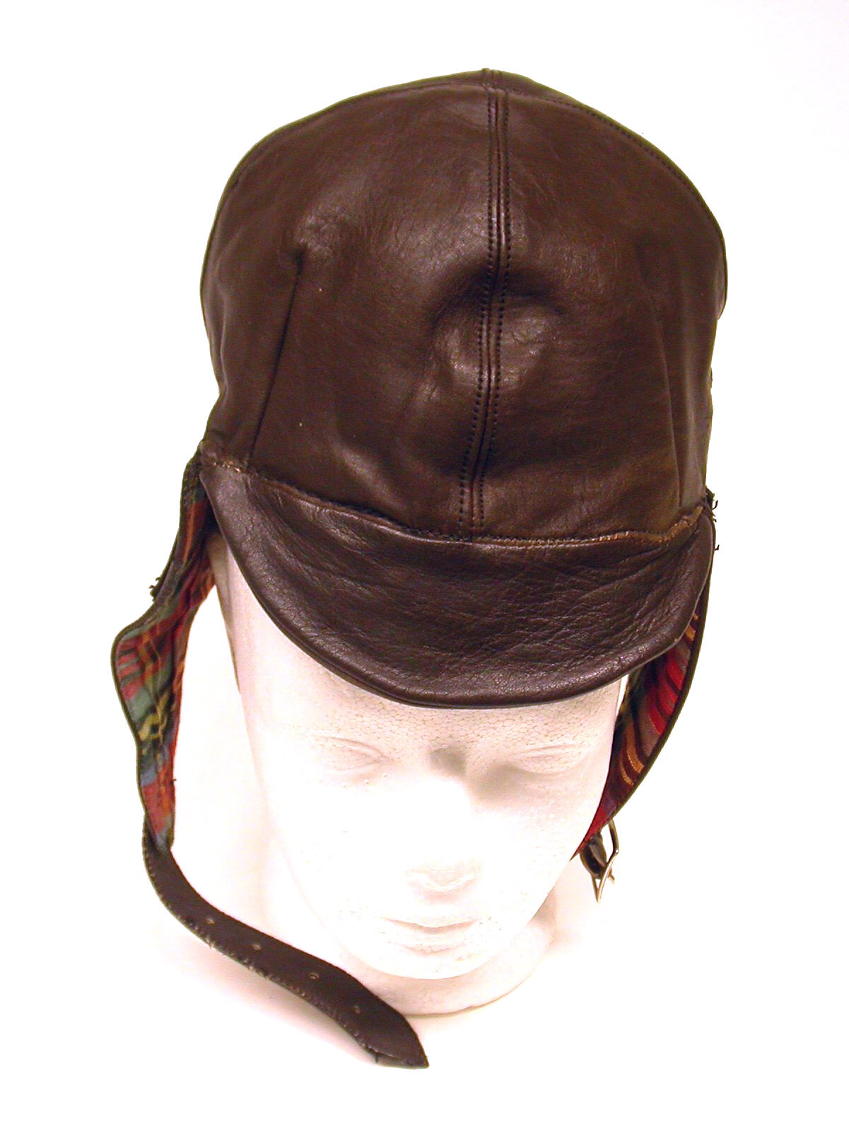 Dark brown leather bicycle helmet lined with red and yellow plaid. Peaked front; chin strap with buckle.
