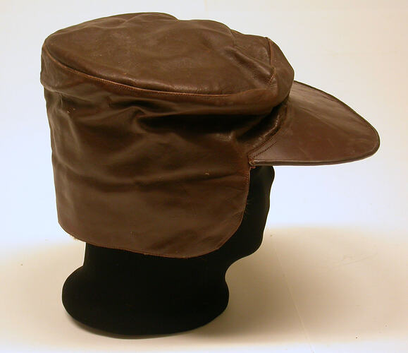 A brown leather hat or cap, the top of which is made from a flat, circular piece of leather from which the sides or walls of the cap extend down. The front face or wall of the cap is shorter than the others, and has a stitched seam in the centre. Below this is a jutting, semi-circular peak also made from brown leather. The wall along the sides and back of the cap extend down further so as to form a type of protective flap over the ears and back of the head. The inside of the cap is lined with rabbit fur which is brown, grey and cream in colour. On the reverse side of the peak of the cap there is some writing in blue pen.