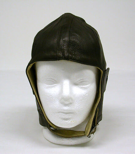 Aviator's helmet dark brown leather lined with chamois and buttoned ear flaps. Made circa 1930-1939 at Simpson's Glove Factory, Richmond, Victoria. Collected from the factory in 1989.