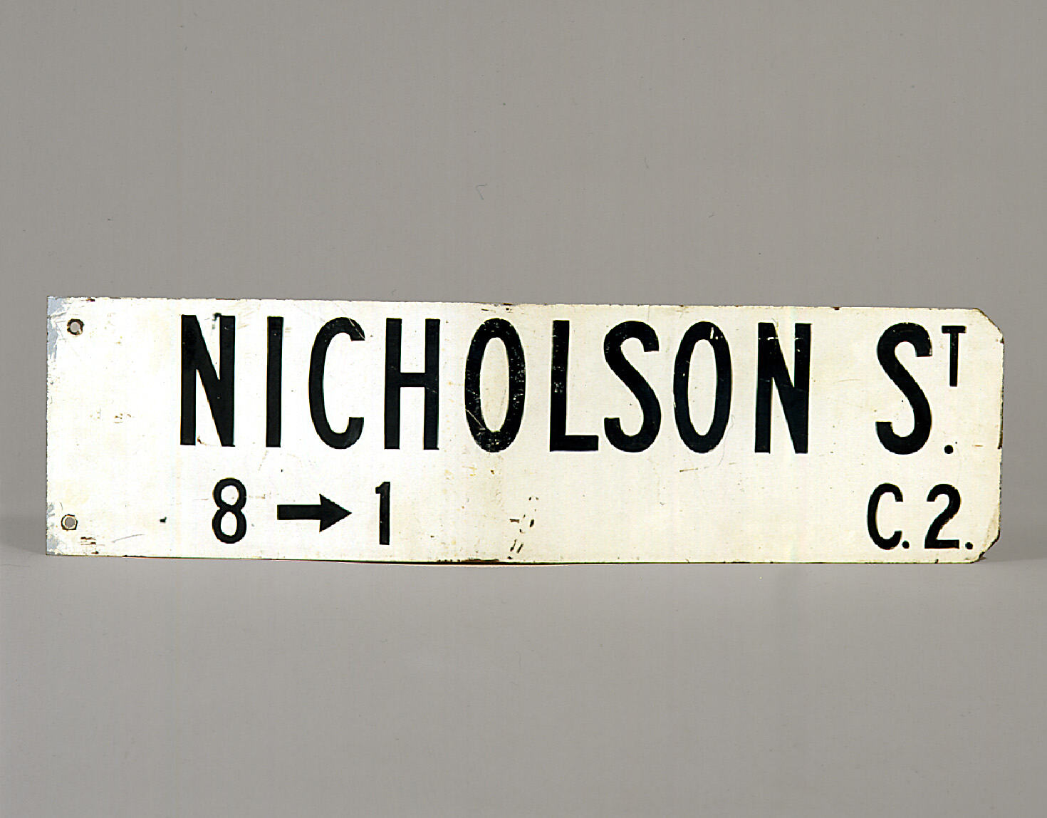 White iron sign with 'NICHOLSON ST' as its main legend. This sign was collected by Whelan the Wrecker and donated to the Museum in 1991 when the company went into receivership. The sign refers to the block southern end of Nicholson Street, from where it emerges from Lonsdale and Spring Streets, up to its intersection with Victoria Parade.