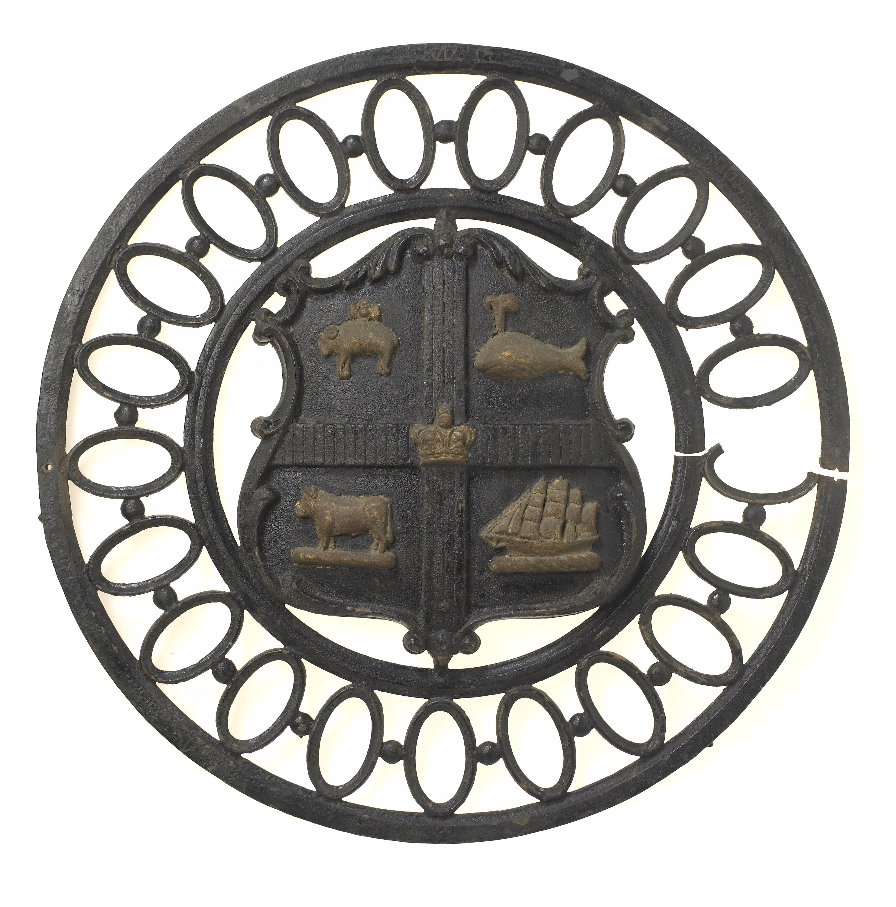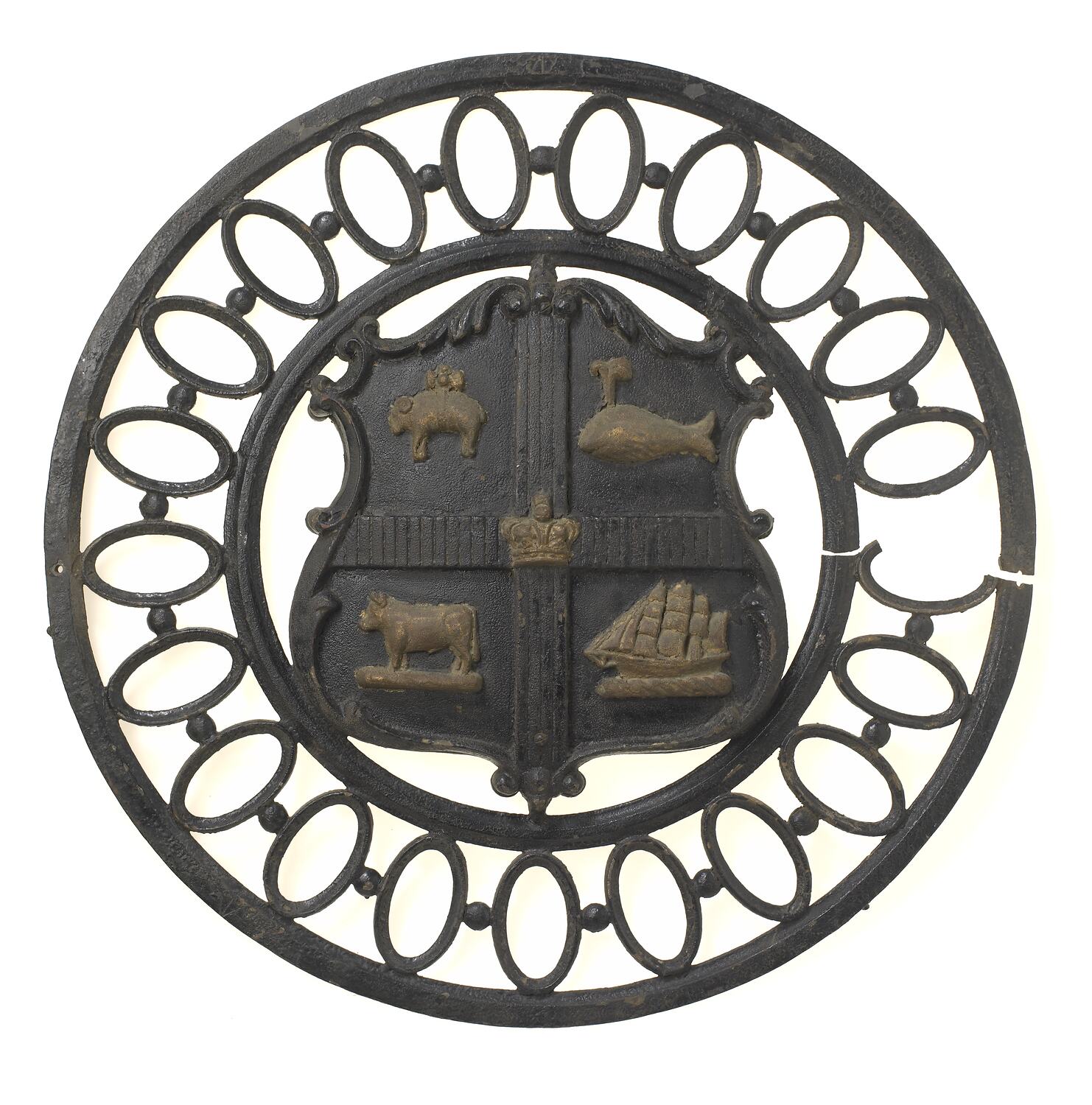Cast-iron coat of arms or emblem of the City of Melbourne. This coat of arms came from the Eastern Market, at the corner of Bourke and Exhibition streets. The market was founded in 1847 and rebuilt in 1879. The coat of arms was repeated in the spandrel panels of the cast iron columns of the 1879 market buildings.