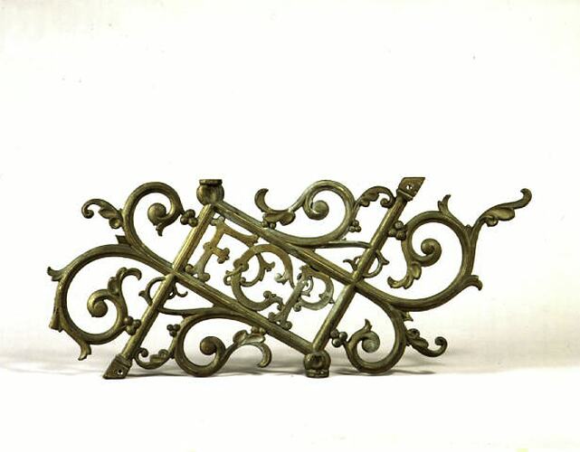 Ornate cast iron decoration that consists of one central rectangle on an angle and circular scroll shapes (arabesques) around it. The initals of the Federal Coffee Palace (FCP) have been worked into the central portion of the piece. There are two main shafts on an angle and holes at both ends show the decoration was fixed to the the building it came from. The piece has been painted gold.