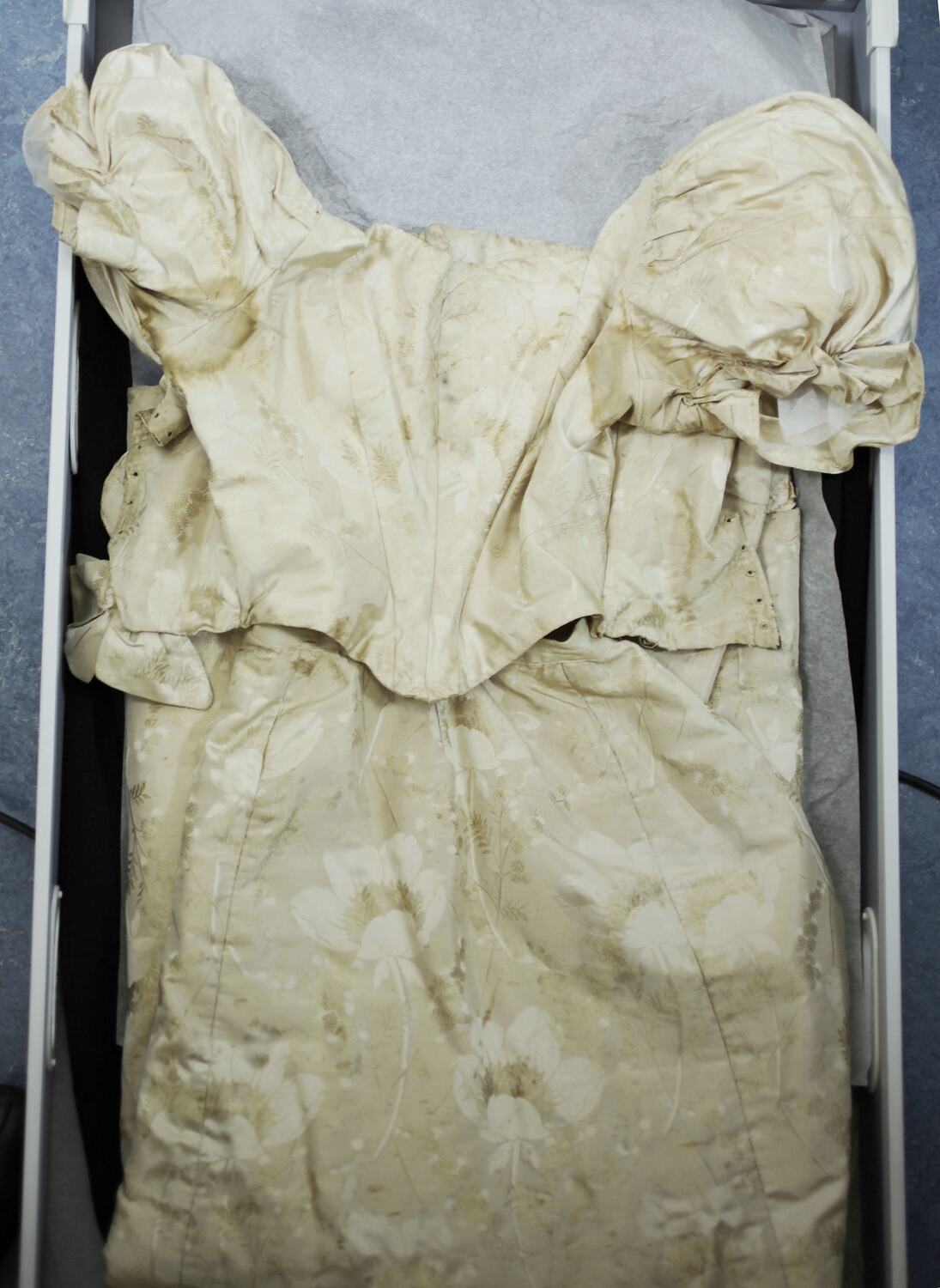 Cream brocade evening gown with tight fitted boned bodice. Bodice laced at back and finished with a bow detail. Short gathered sleeves. Full skirt dips and fans out at back. Brocade ruffle sewn inside hem. Possible bustle? Machine- sewn; hand-finished. Heavy gauge hooks to secure skirt and bodice. The dress is stained in multiple places, particularly the underarms. It has patches of blue discolouration on the lower skirt back.