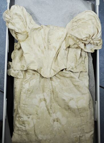 Cream brocade evening dress owned and worn by Miss Annie Boyd, the donor's great-grandmother. Miss Boyd lived in East Melbourne (now the site of the Bethesda Hospital). The dress probably dates to the 1890s (based on style).