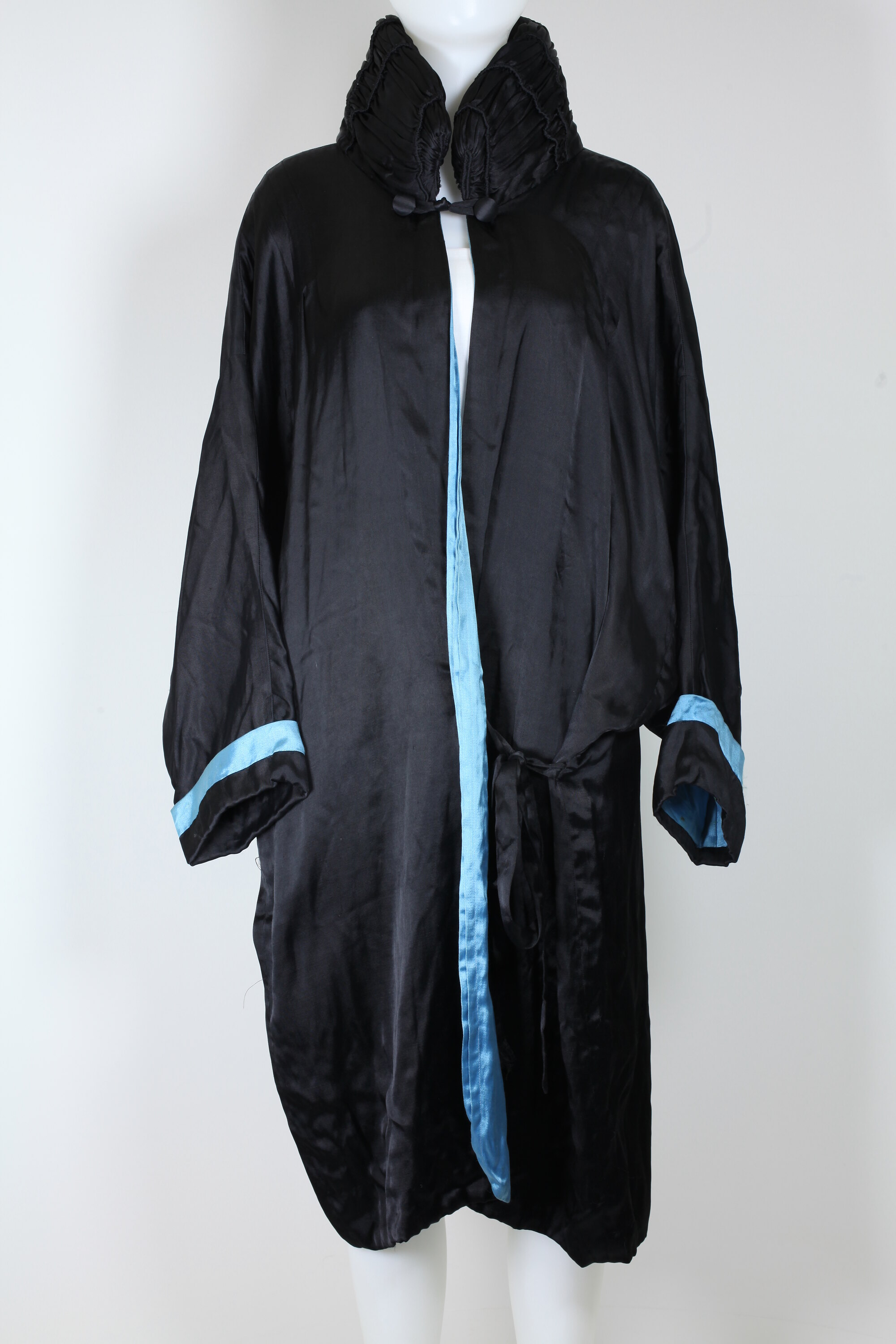 Black satin evening coat with blue satin lining. Coat has padded, ruched collar with self-covered buttons at either side and loop fastening; three pin tucks on front and back shoulders. Dolman sleeves with wide-folded cuff and blue satin trim. Fastens at waist on left side with two long black satin ties. Lining is sewn in pleats at edges of front opening and fold over to form trim at front. Small, blue satin pocket with rouched edge sewn to lining on left side.