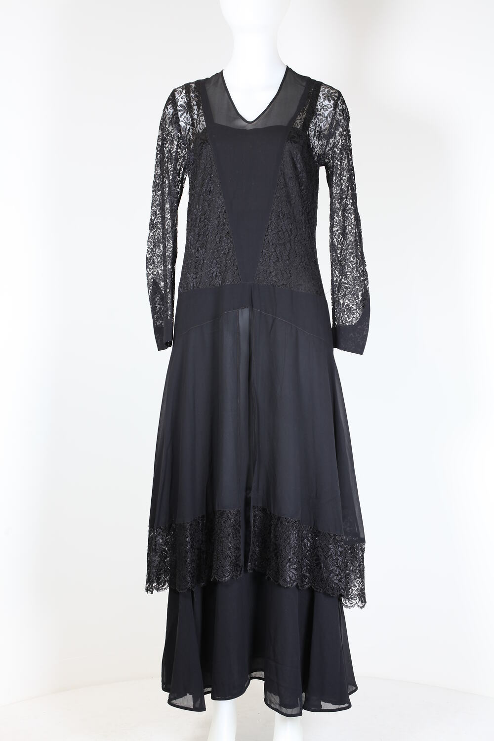 Black dinner dress of silk georgette and silk machine lace with drop waist. Bodice made of machine lace. Front bodice features a central tapered georgette panel, extending into V neckline. Back bodice features a central triangular georgette panel. Long fitted sleeves made of machine lace finished with mock cuffs with triangular shape on outer arm. Cuffs fasten with two black metal press studs. Underside of cuff opening finished with a pinked edge. Shaped yoke at dropped waist. Georgette overskirt attached to yoke with centre front opening and scalloped lace trim. Georgette underskirt with bottom flounce. Bottom flounce of skirt is lined with silk. Black silk camisole-like lining with shoulder straps stitched at shoulder seam and below waist. Length of black georgette was in a bow (now untied) - possibly attached at centre front waistline where pin holes are visible.