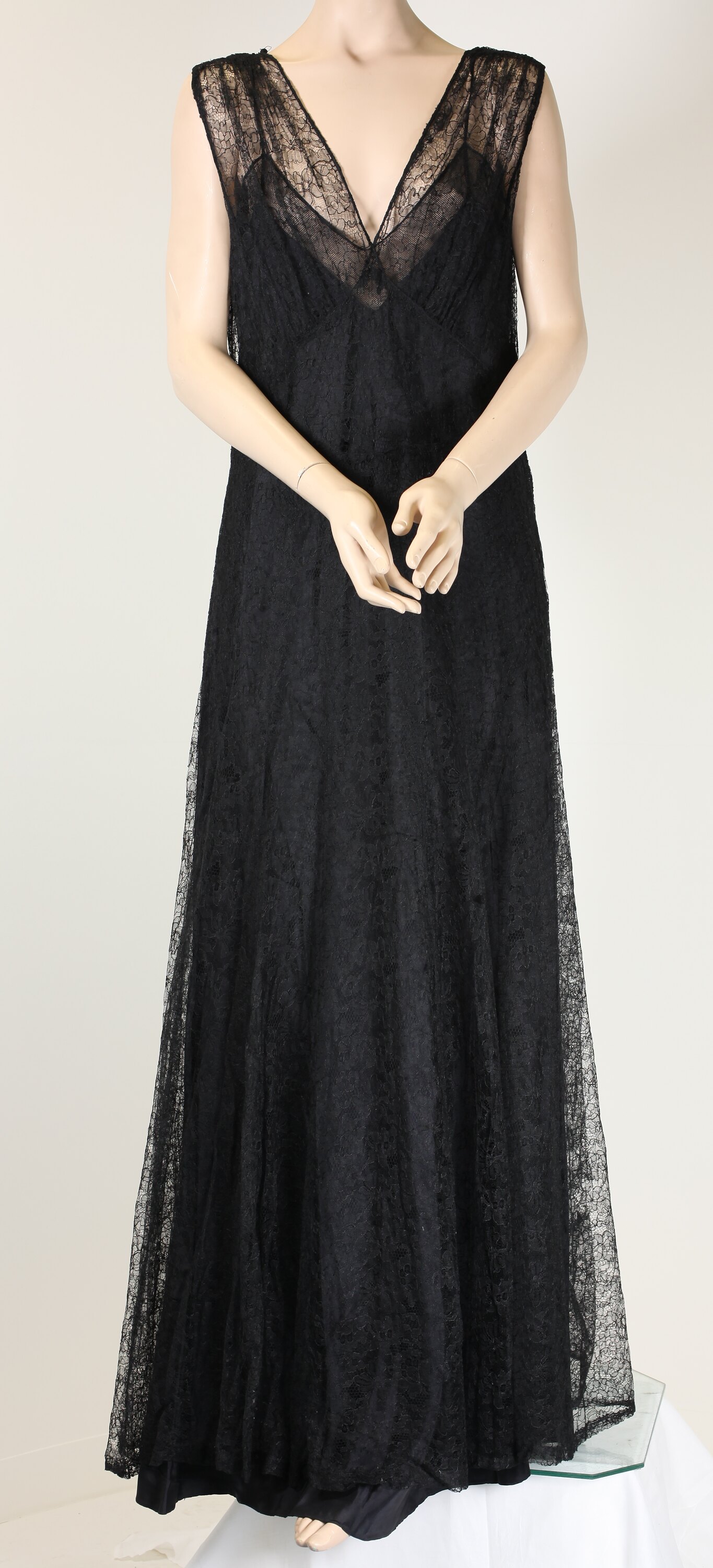 Black floor-length floral machine lace dress with black taffeta slip. Probably includes semi-synthetic materials - the slip may be rayon ('artificial silk'), made commercially in America from 1910 from regenerated cellulose fibre.