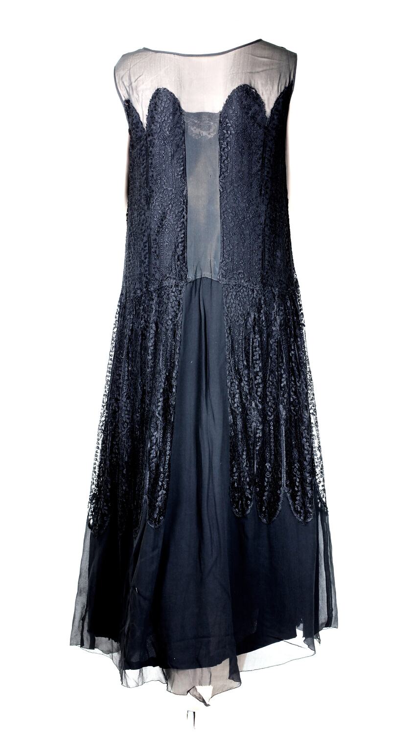 Sleeveless scoop-necked evening dress made of black chiffon and machine lace. Sheer chiffon body has dropped waist with panels of lace embedded from bust to 3/4 down the skirt. Skirt fabric slightly gathers at side of dropped waist. The chiffon layer has a modified handkerchief hem with a machined finised edge. The neckline and arm holes are finished with bias binding made from self fabric. Thin stap holder with silver press stud at shoulder. The dress is lined in black silk attached via the scalloped lace at bust. Front and back center panels have a lace trim on lining visable through the sheer chiffon. Skirt lining has side panels which are tiered with two rows of fringing. The purpose of these is probably to give body or show on the dance floor. The lining hem is finished with a long hand stitch.