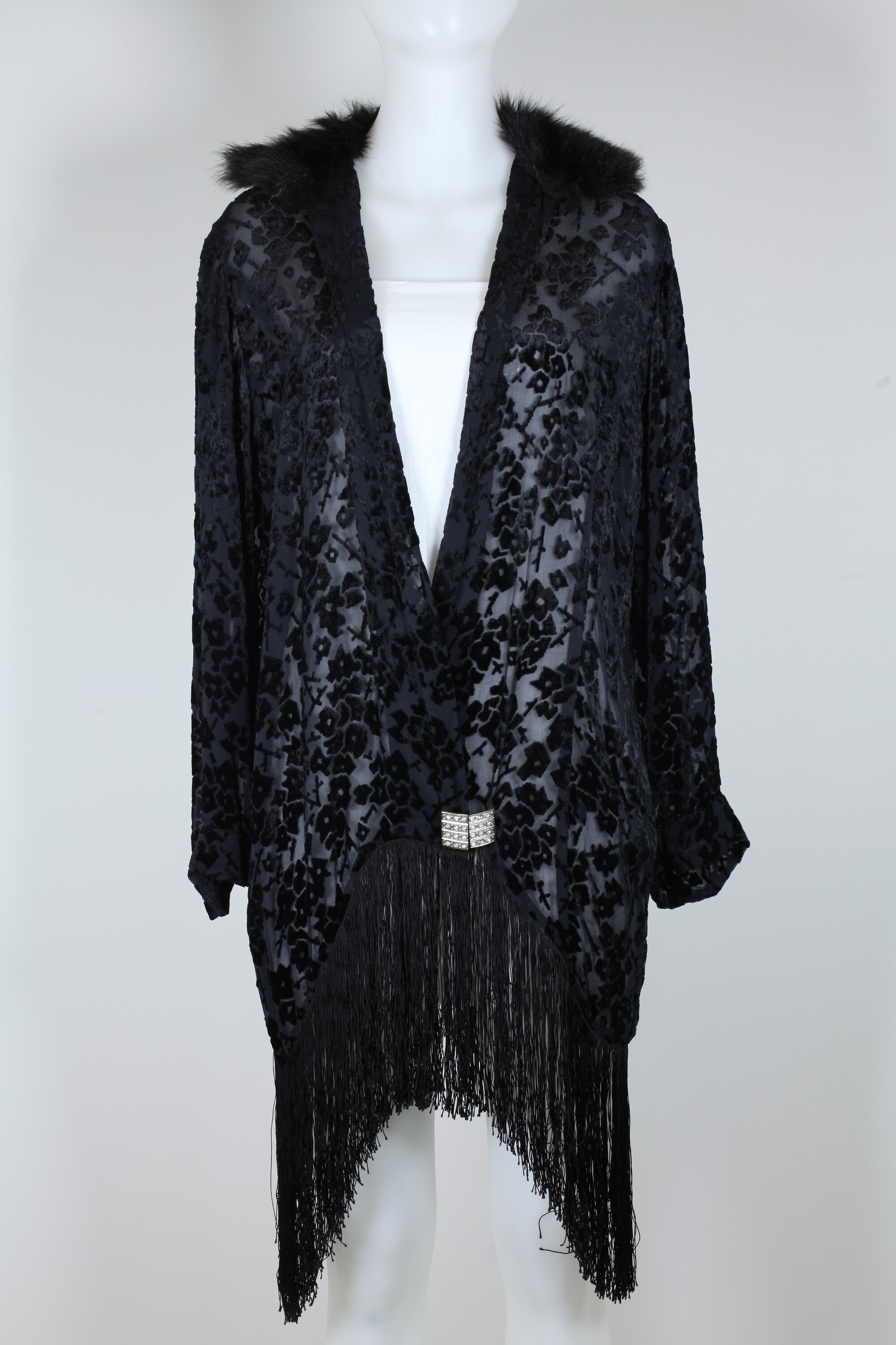 Evening coat made of sheer black georgette embossed with velvet in a floral pattern. Black fur collar and open shawl neckline. Coat fasteners at hem with paste clasp in silver, black and glass. Hem lowers at sides. Silk fringe falls from hem. Long sleeves with 40mm hem. Inner side of sleeve hem tacked above hem, creating slight shaping at wrist. Five 20mm long vertical pin tucks at centre back neckline.