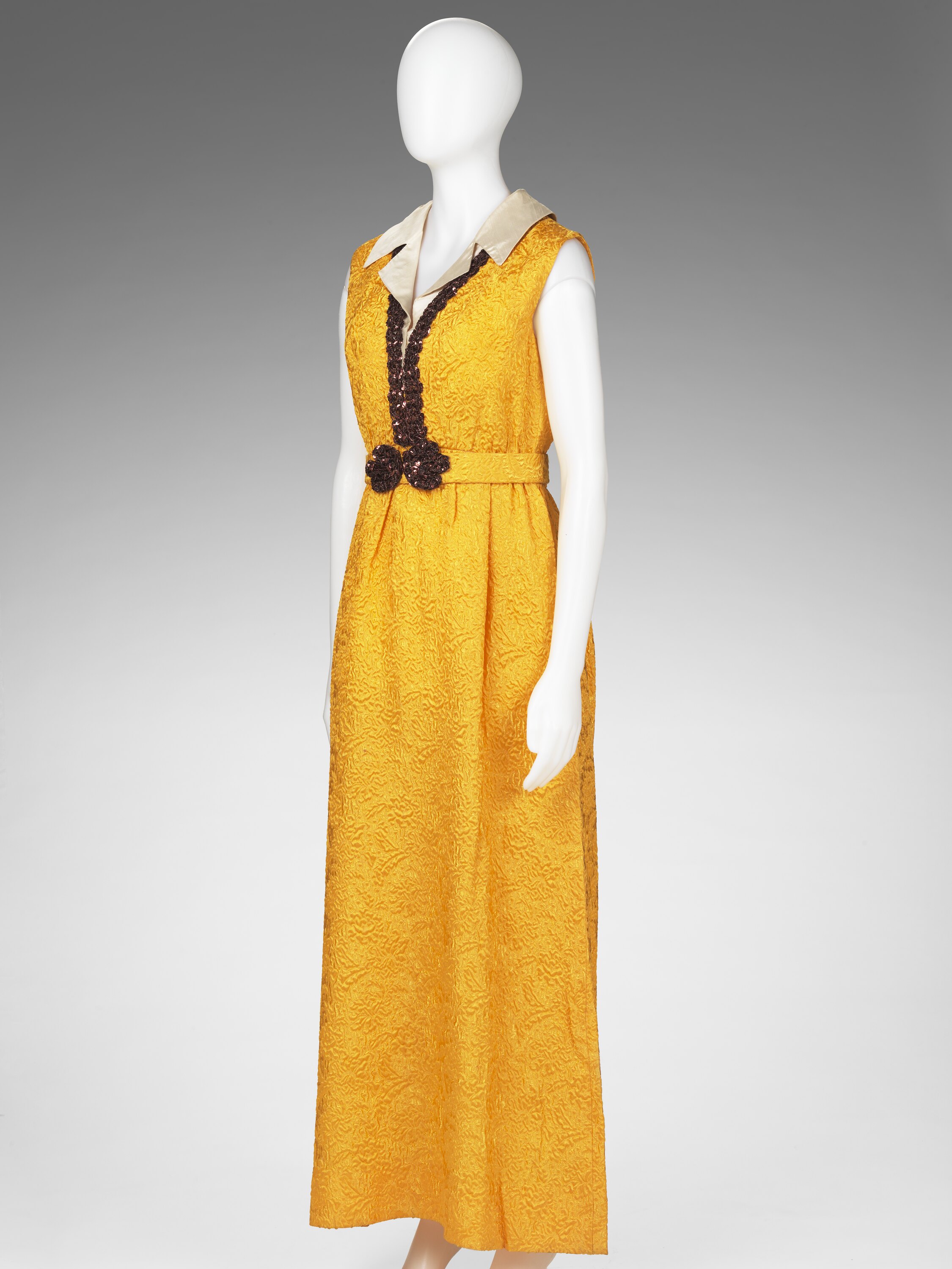 Bright yellow self-coloured brocade full length dress with brown sequined decoration. Dress is sleeveless with off-white V-neck collar of chantony weave synthetic silk. Back opening is fastened with a zip and skirt slightly gathered at waistline, and slightly A-line. Braid sewn around neckline and two ends meet at front of waist consists of interwoven burgundy coloured sequins and shiny beading strands of the same colour sewn together. A belt goes with it consisting of a double-sided strip of yellow brocade with stiffened fabric inside. Two hook and eyes attached to ends for fastening. Two paw shaped motifs sewn onto centre of band consist of same brown braid as above.