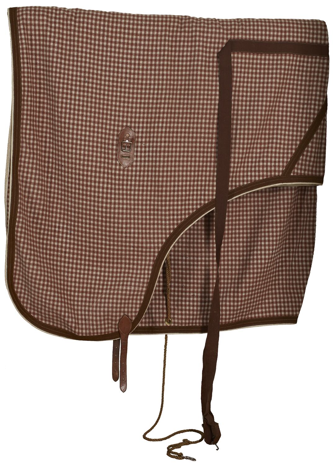 Rectangular woollen horse rug in brown and white checked material bound with brown wool tape. Brown cotton tape fastenings. Leather straps.