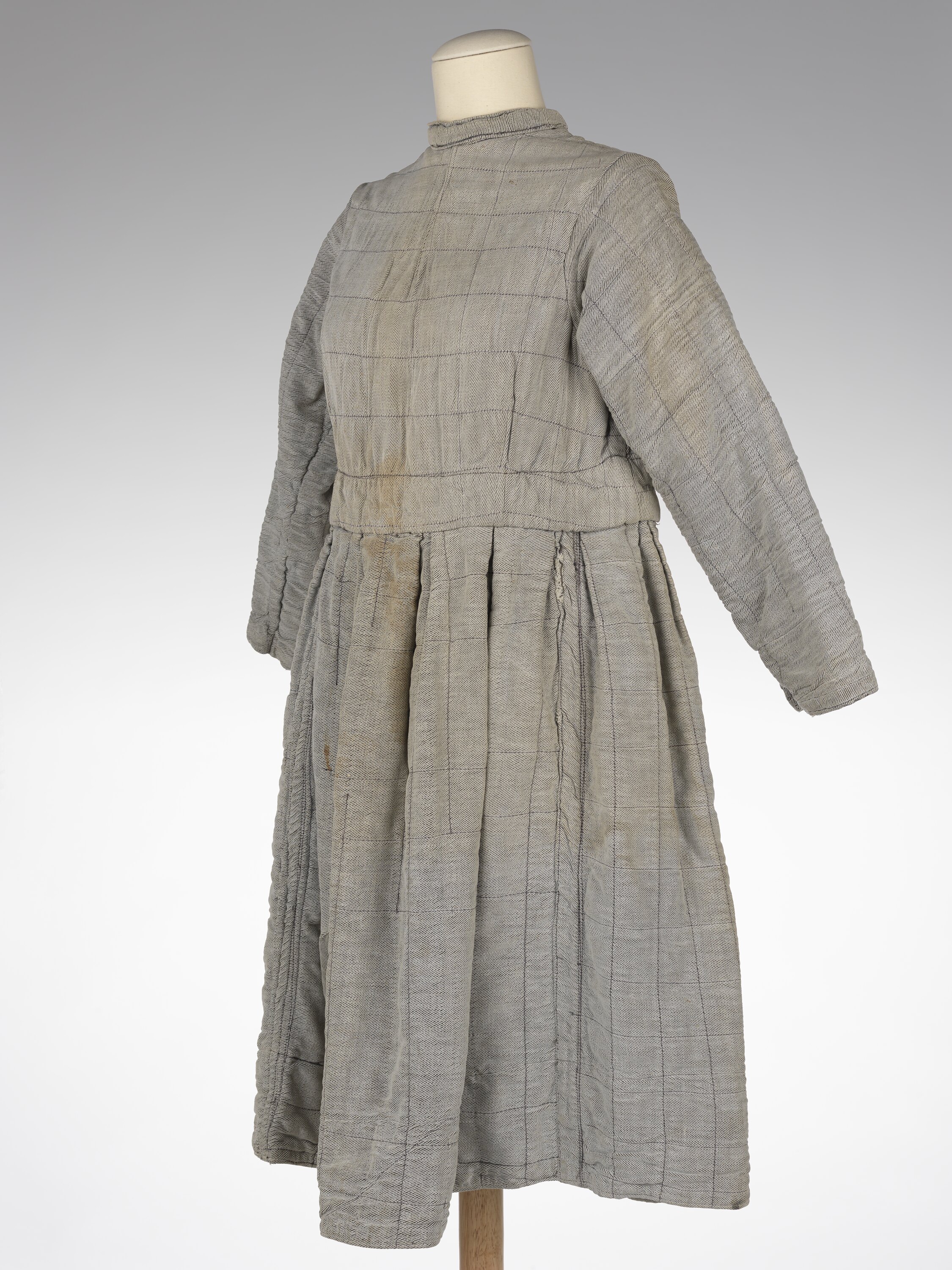 Grey (faded) very heavy cotton dress, lined, and quilted with black stitching. Has a waistband and gathered skirt, round neck and narrow stand-up collar. Eyelets from neck to the waist at back. Long sleeves.