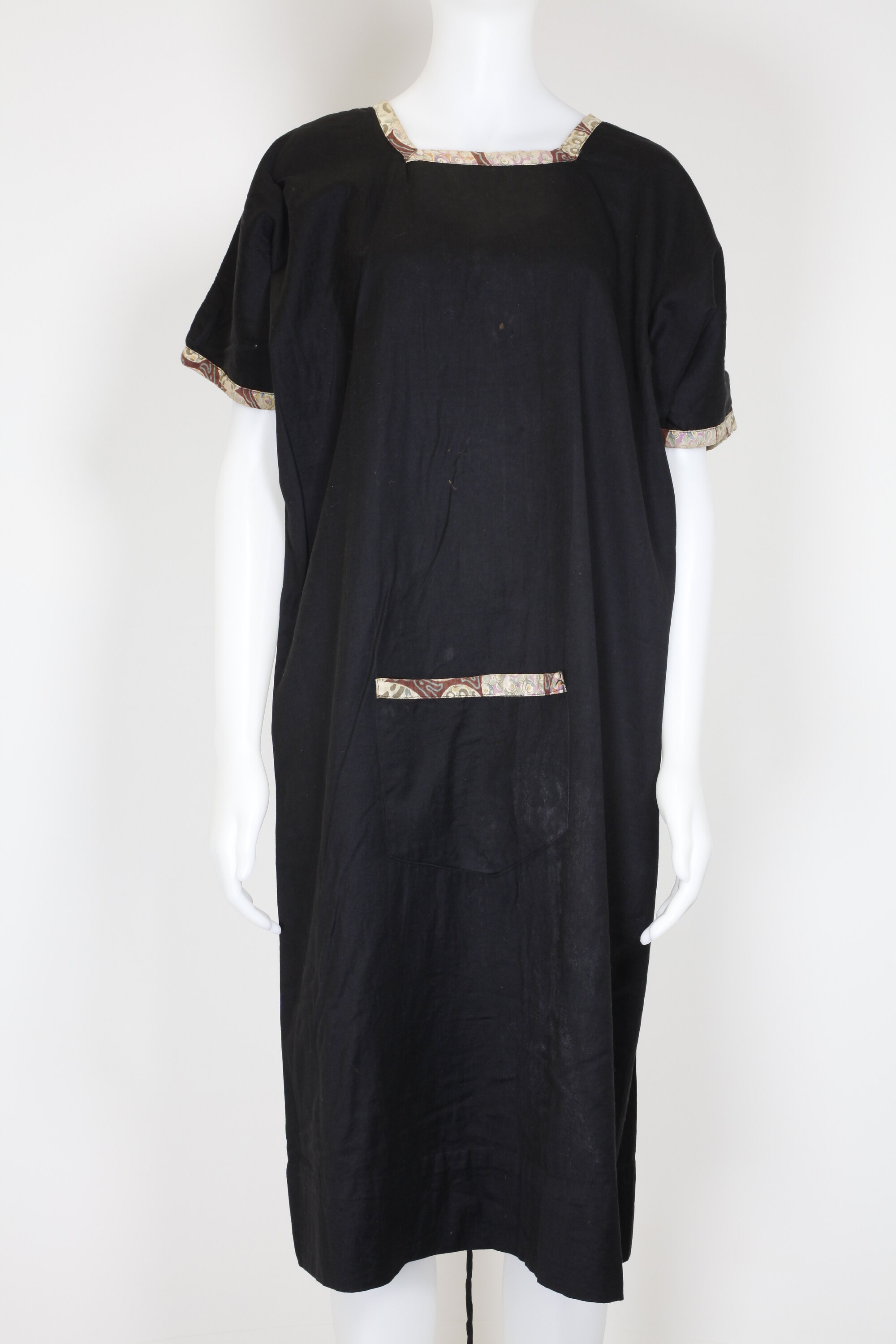 Black pinafore with floral edging on neck, sleeves and pocket. Pinafore has a square neckline with short kimono sleeves and a large patch pocket at the centre front. The garment is open at the back and fastened with a black metal hook and eye and a tie belt of the same fabric as the dress. The belt is attached to the left back at the waist.