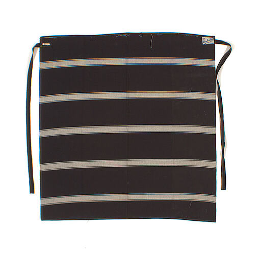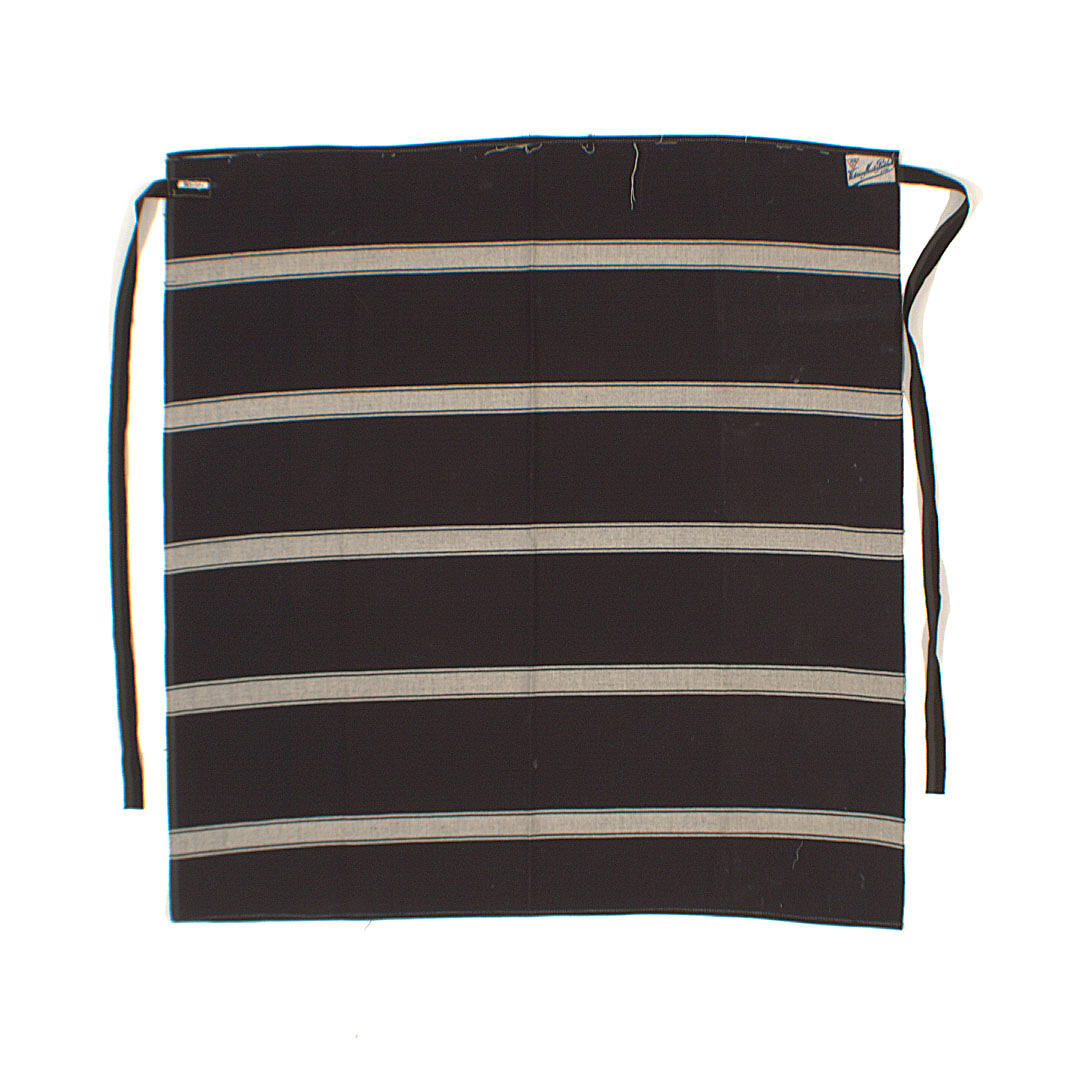 Butcher's apron, made of dark blue cotton with white stripes. Two black straps are sewn to the apron's sides so that when tied will give protection to the lower forepart of the body.