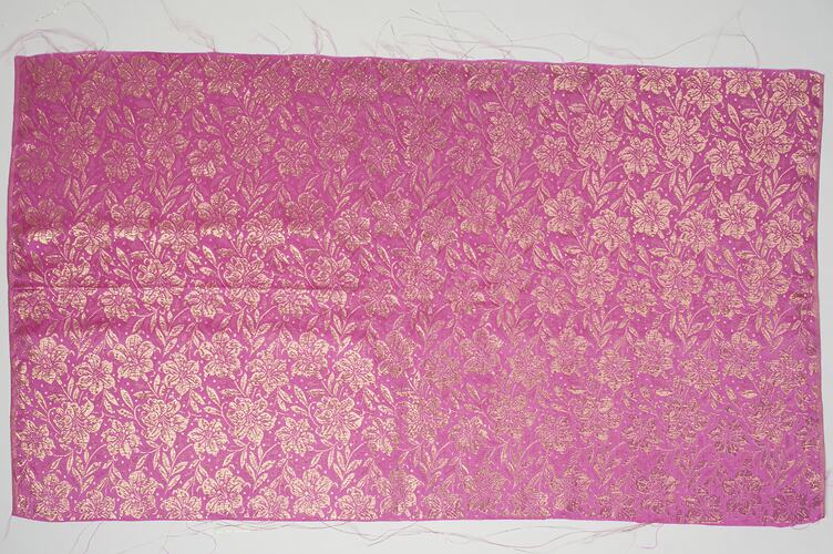 Pink nylon brocade fabric remnant with gold thread in flower pattern.