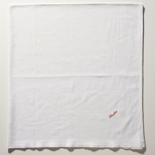 This white cotton tablecloth is part of the furnishing and equipment used at Florentino Restaurant in Bourke Street Melbourne, during the time of Branco Tocigl's ownership from 1979-1989.