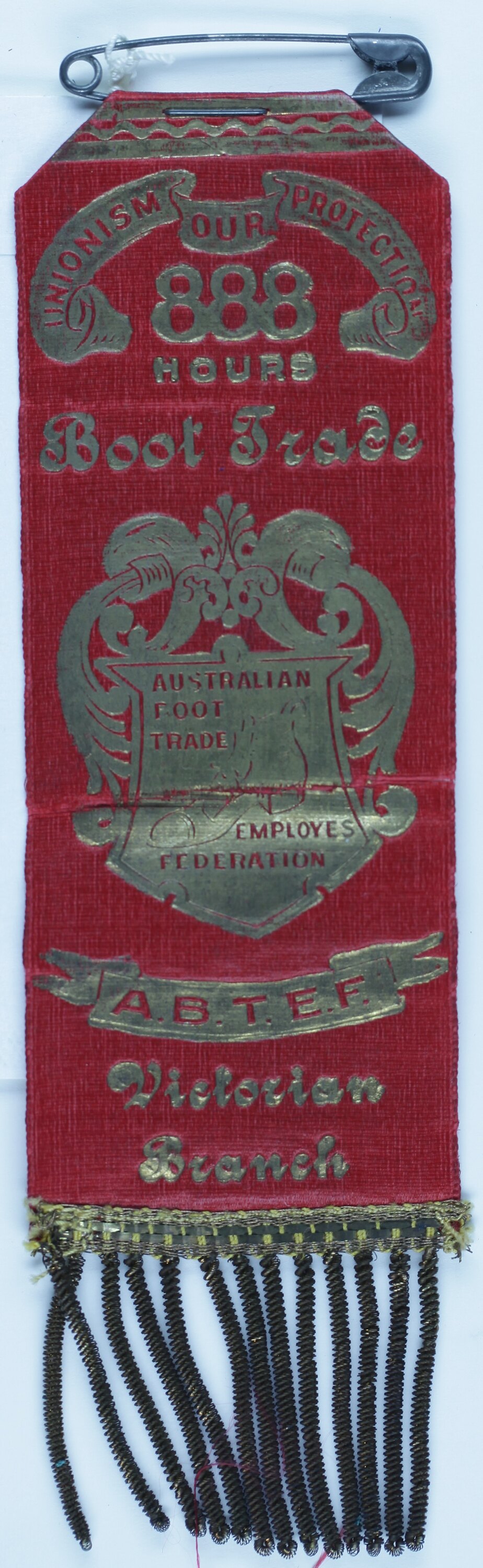 Red ribbon with gold tassle sewn to the bottom. A crest is located at the top of the ribbon, it features the words 'Unionism Our Protector' and underneath this is printed '888 Hours'. In the centre a gold emblem appears. It features a boot surrounded by printed text and fancy crests. The lower section features a gold ribbon embossed with the Federation letters and the branch name. A large safety pin is attached to the top of ribbon. A staple is holding the pin in place.