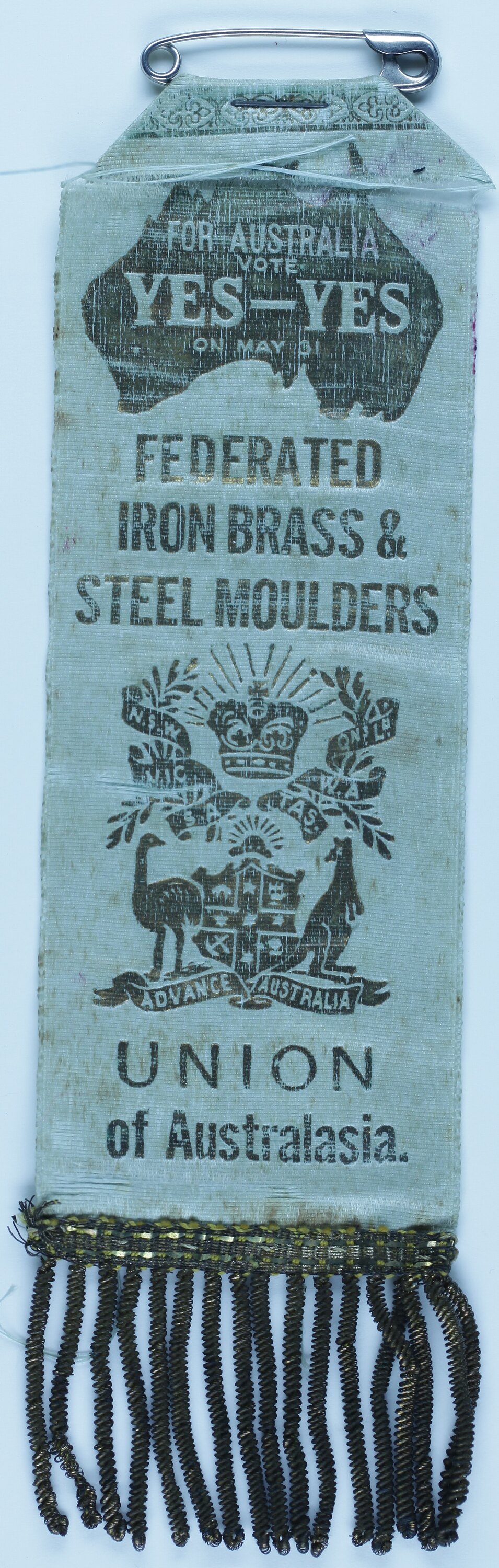 Printed Text: 'FOR AUSTRALIA/VOTE/YES-YES/ON MAY 31/FEDERATED/IRON BRASS &/STEEL MOULDERS/UNION/OF AUSTRALASIA'.