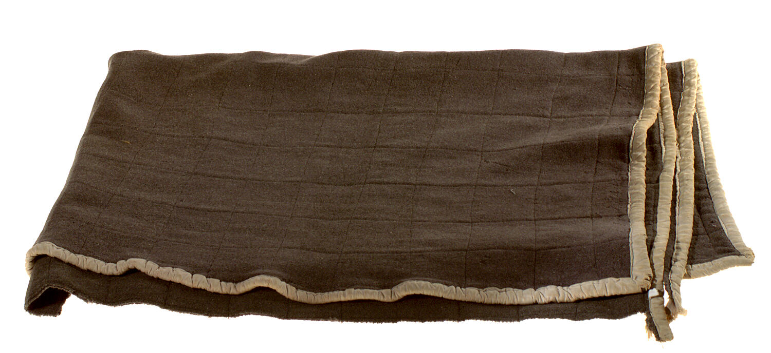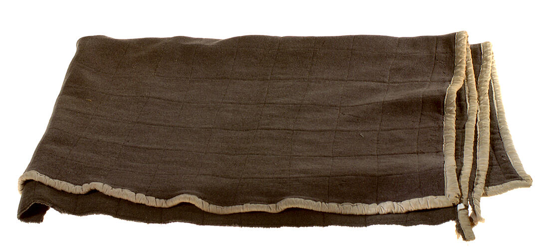 Single blanket of grey woollen material. Two layers are sewn together in quilt stitching to form 9cm squares. It is bound aroud the edge with a 2cm strip of white calico (partly missing). A 5cm deep strip has been cut away along parts of one side. Hand made out of pieces of a once larger blanket, in the tradition known as 'Wagga'.