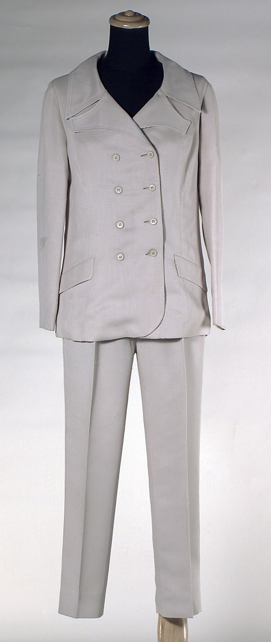 Prue Acton was photographed by Helmut Newton and Henry Talbot in this suit and a black version. Museum Victoria holds copies of both these images.