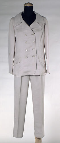 The suit consists of a twill jacket and pants. (1) Jacket is long-line tailored double-breasted with vent at the back. The short belt is buttoned to the back. The collar has sculptured revers. The front jacket features two false pockets and two rows of beige plastic buttons at fastening. The jacket is lined in beige polyester. (2) Straight legged hipster style pants with zippered front opening. Unlined.
