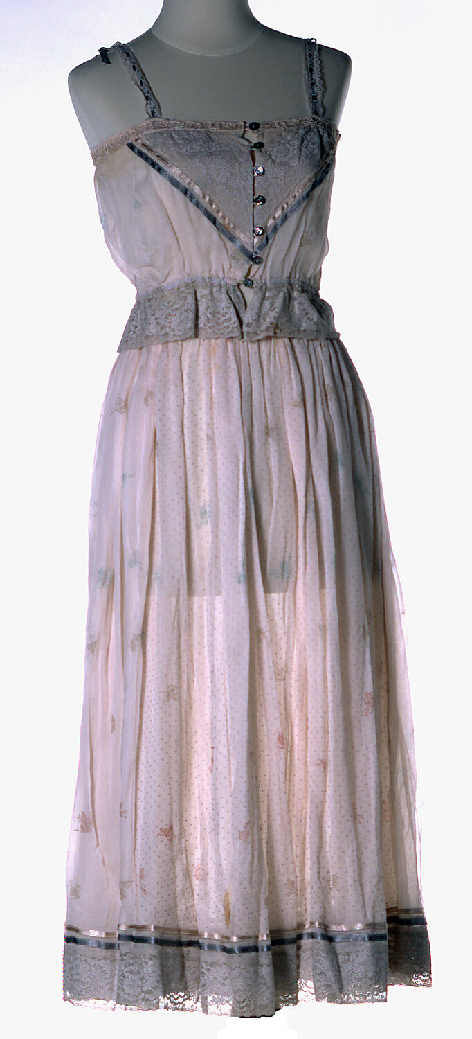 This is a nine piece oufit of pale peach georgette crepe, heavily trimmed with laces and ribbon in oyster, peach and grey. Crepe is overprinted in very delicate blue-grey motifs. (1) Collarless jacket with 3/4 sleeves. Loose at the front. Flowing & transparent (2) Camisole top with lacy shoestring straps. Elastic waist. Grey pearl buttons. (3 ) Mid-calf length skirt with shirred waistband. (4) Choker neckpiece in peach lace trimmed with feathers and fabric flowers. (5) Choker neckpiece in beige lace trimmed with feathers and shells. (6) Plaited cord belt in silver, each end split in 3 and trimmed with feathers. (7) Belt of cream-coloured twisted cord, knotted and fringed at the ends. (8) Plaited cord belt in cream, each end split into 3 and trimmed with feathers. . (9) Reticule of beige crochet, decorated with lace, shells and pink tassels. Suspended by hanks of embroidery thread in various colours.