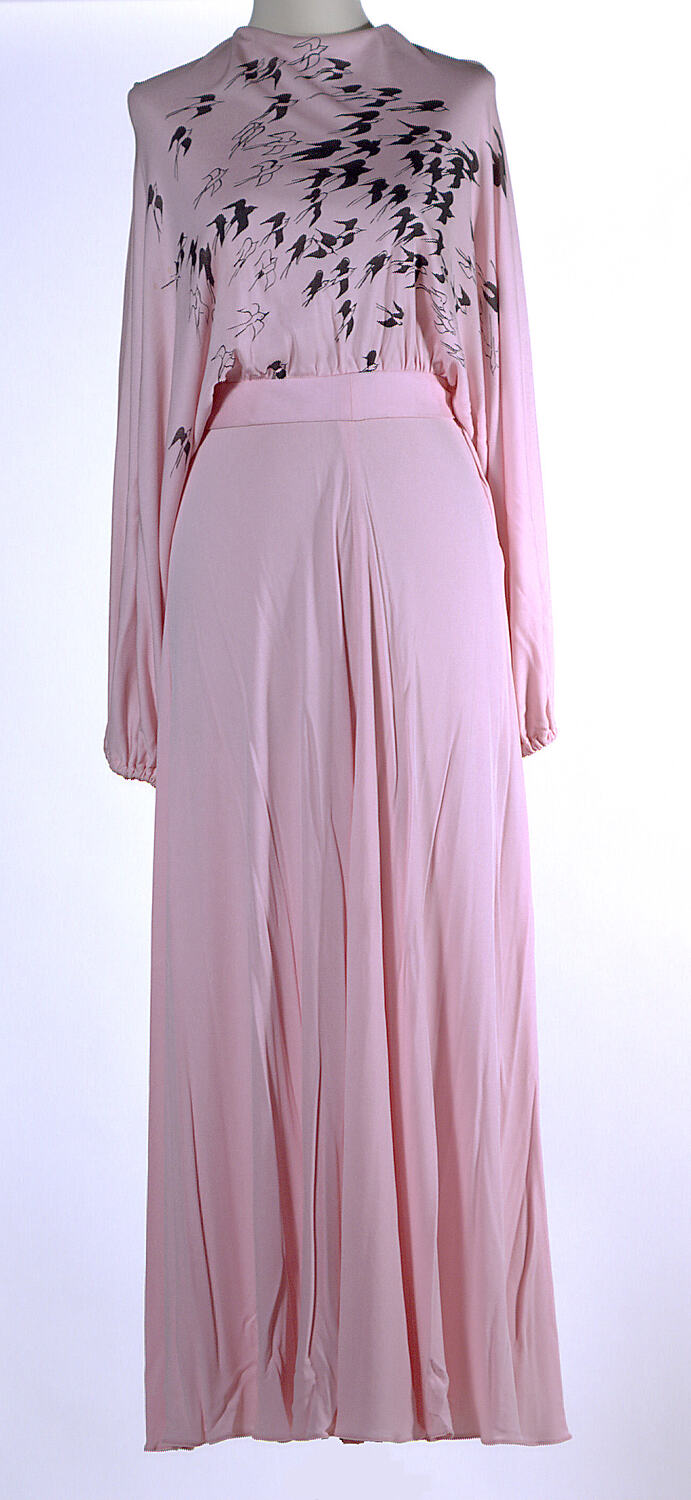 Outfit consists of a pink jersy top and skirt: (1) Pink jersey full length evening skirt. (2) Pink jersey top with Dolman sleeves and back split opening fastened with ties top and waist. The front features a flock of birds in black.