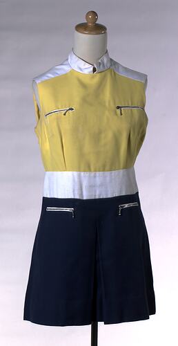 Sleeveless 'A-line" mini dress with mandarin collar and zippered breast and thigh pockets. The bodice is yellow. Shoulders, collar and waist insert are white and the skirt is navy. The front skirt has an inverted pleat. The garment is fastened at the back with a zipper from neck to lower back.
