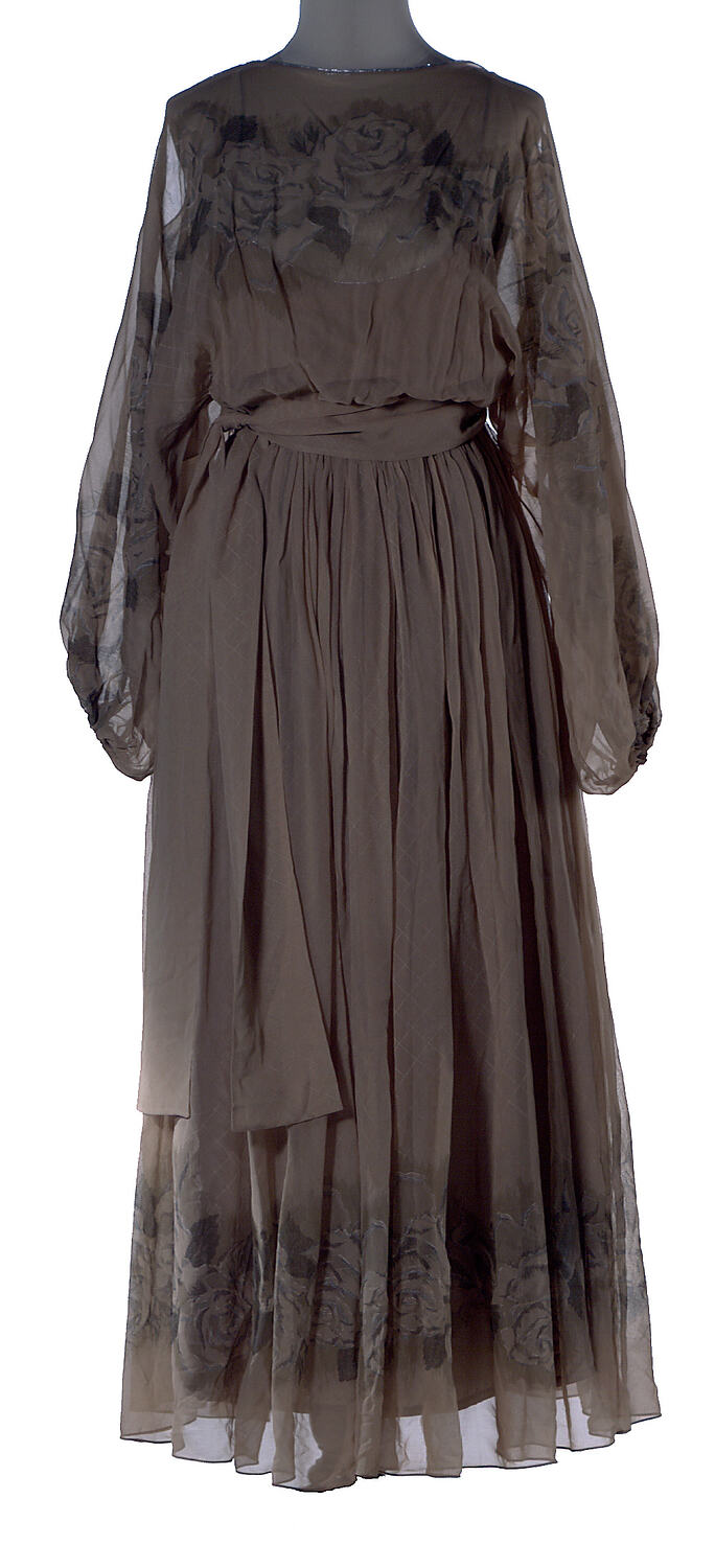 Dress and sash set: (1) Ankle-length long-sleeved evening dress in beige coloured silk georgette, decorated with all-over lattice print, with a brown and silver rose pattern at bodice, sleeves and hem.. Under shift of georgette and beige silk is attahed at elasticized waist, and at one shoulder. Bodice fastening at one shoulder with hook-and-eye. (2) Beige georgette sash with faint lattice print.