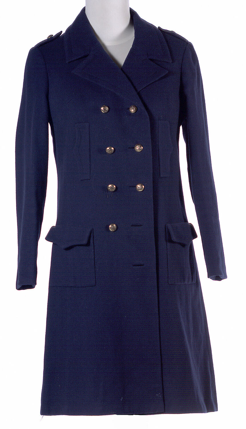 Navy woollen double-breasted military style mini coat fastened with 7 brass buttons (one is missing). The coat has shoulder epaulettes with brass button decorating peaked lapels and has two flap pockets. The back has two inverted pleats and lined with navy rayon.